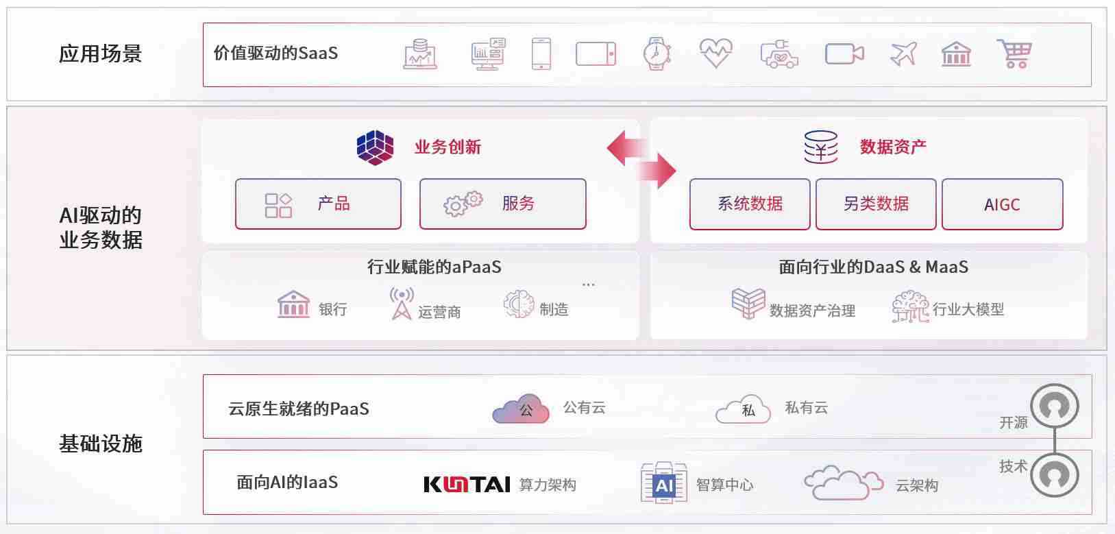 数字时代,,,,围绕企业数字化转型的关键要素,,,,OK钱包数码开创性的提出数云融合战略和技术体系框架,,,着力在云原生、、、数字原生、、、AI原生和信创产业上架构产品和服务能力,,,为处在不同数字化转型阶段的快消零售、、、汽车、、、、金融、、、医疗、、、政企、、教育、、、、运营商等行业客户提供泛在的敏捷IT能力和融合的数据驱动能力,,构建跨界融合创新的数字业务场景和新业务模式,,助力企业级客户建立面向未来的核心能力和竞争优势,,全面推动社会的数字化、、、智能化转型升级。。